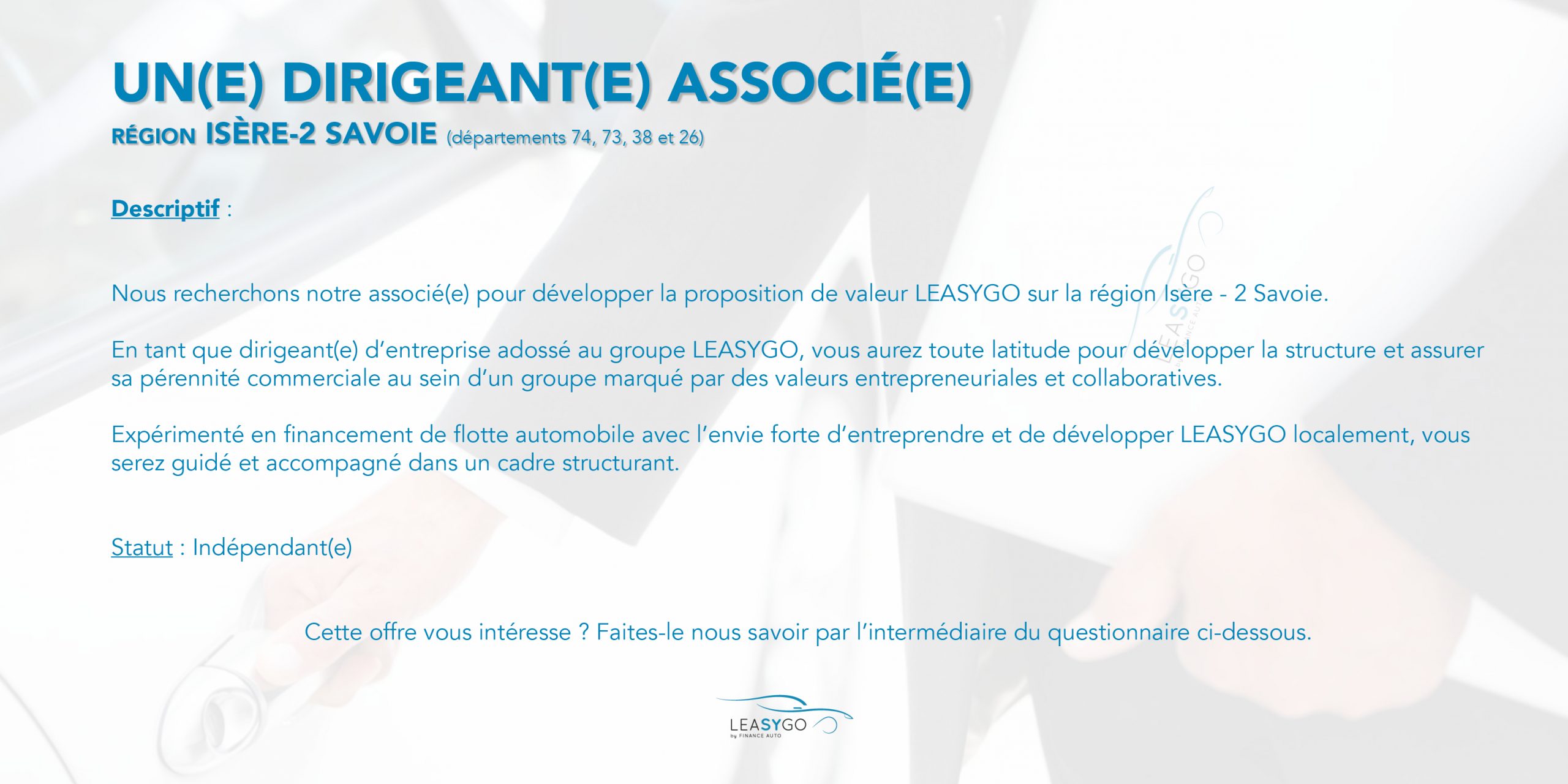 Rejoignez l’équipe des dirigeants de LEASYGO en étant associé au capital. Vous bénéficiez des partenariats les plus prestigieux, prenez part au développement du groupe et faites rayonner notre proposition de valeur sur votre région.